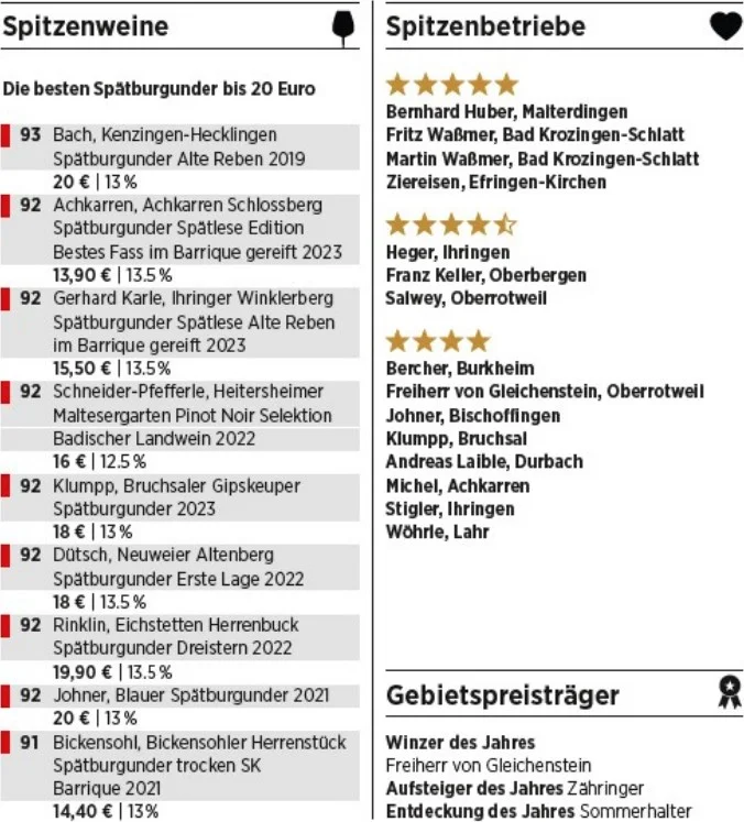 Bester „Anderer Rotwein“ Deutschlands: 2022 Herbolzheimer Kaiserberg Cabernet Franc, Fritz Waßmer – 95 Punkte, dicht, präzise und mit eigenständiger Handschrift. Baden 2026 – das Fazit Baden steht heute für beides: für Kontinuität und Aufbruch. Die großen Namen bleiben stark, doch die Zahl der exzellenten Betriebe wächst stetig. Vom Breisgau über den Kaiserstuhl bis hinunter ins Markgräflerland zeigt sich die Region als Bühne für Burgunder mit Haltung. Baden hat seinen Stil gefunden – und macht deutlich, dass Größe hier kein Zufall, sondern das Ergebnis von Leidenschaft, Erfahrung und Präzision ist.
